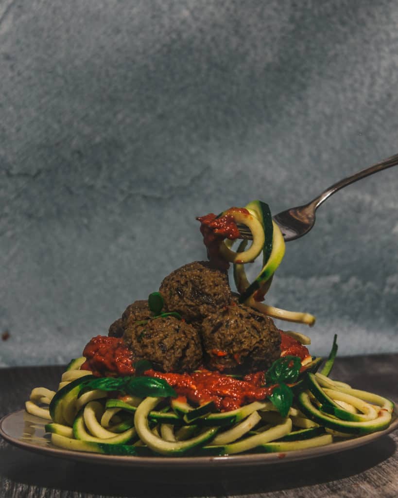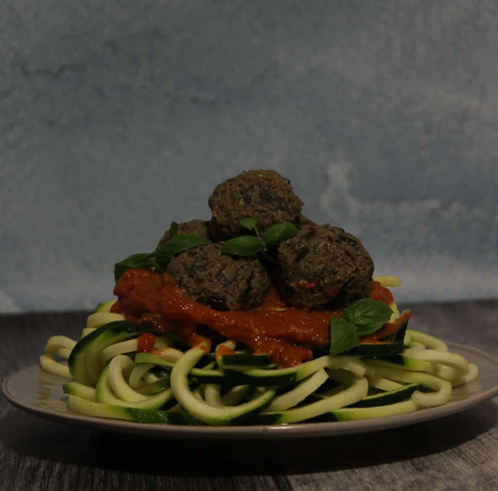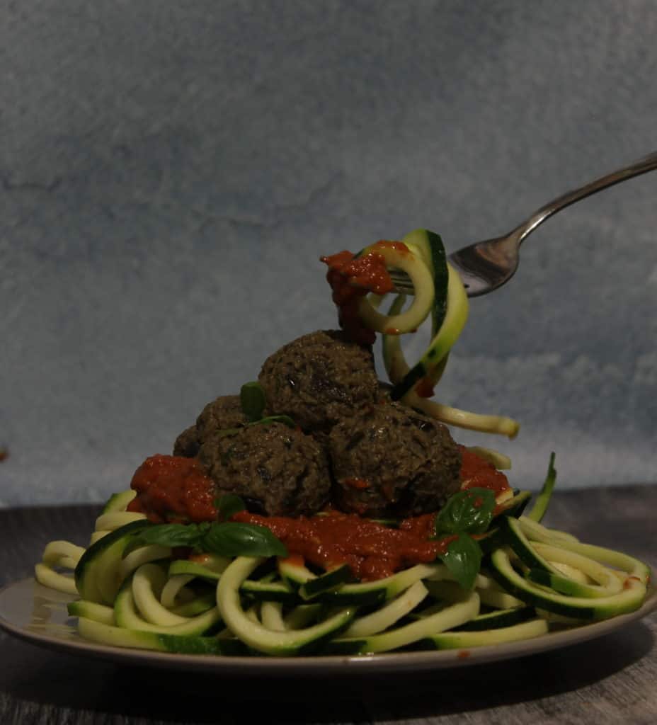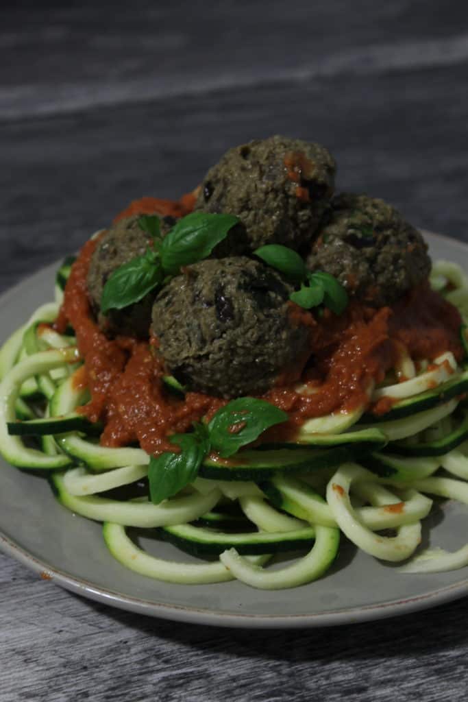 Serve over over zucchini pasta topped with raw marinara sauce.
